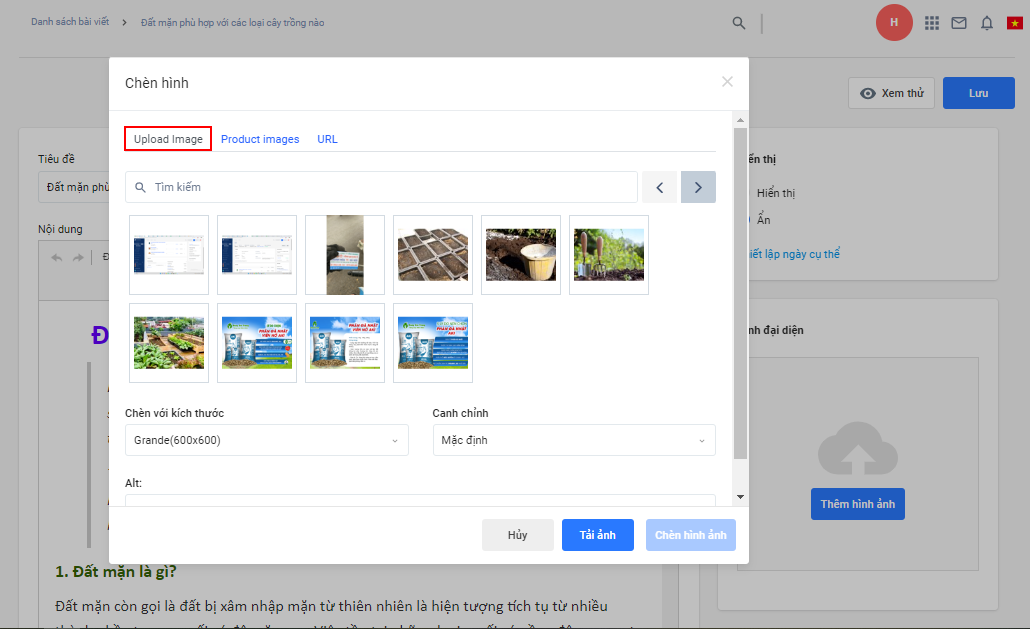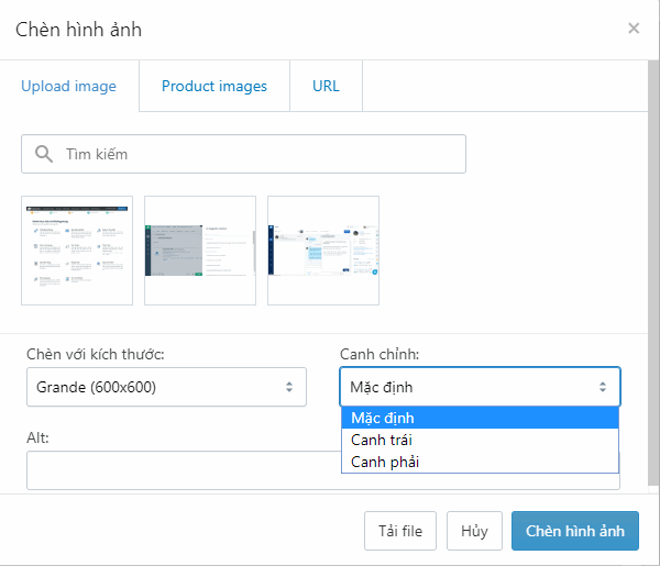 - Upload image: Lựa chọn này sẽ bao gồm các hình ảnh đã được tải lên trong mục Quản lý file hoặc nhà bán hàng có thể chèn từ hình ảnh có sẵn hoặc thêm hình ảnh mới bằng cách nhấp chọn nút Tải ảnh.