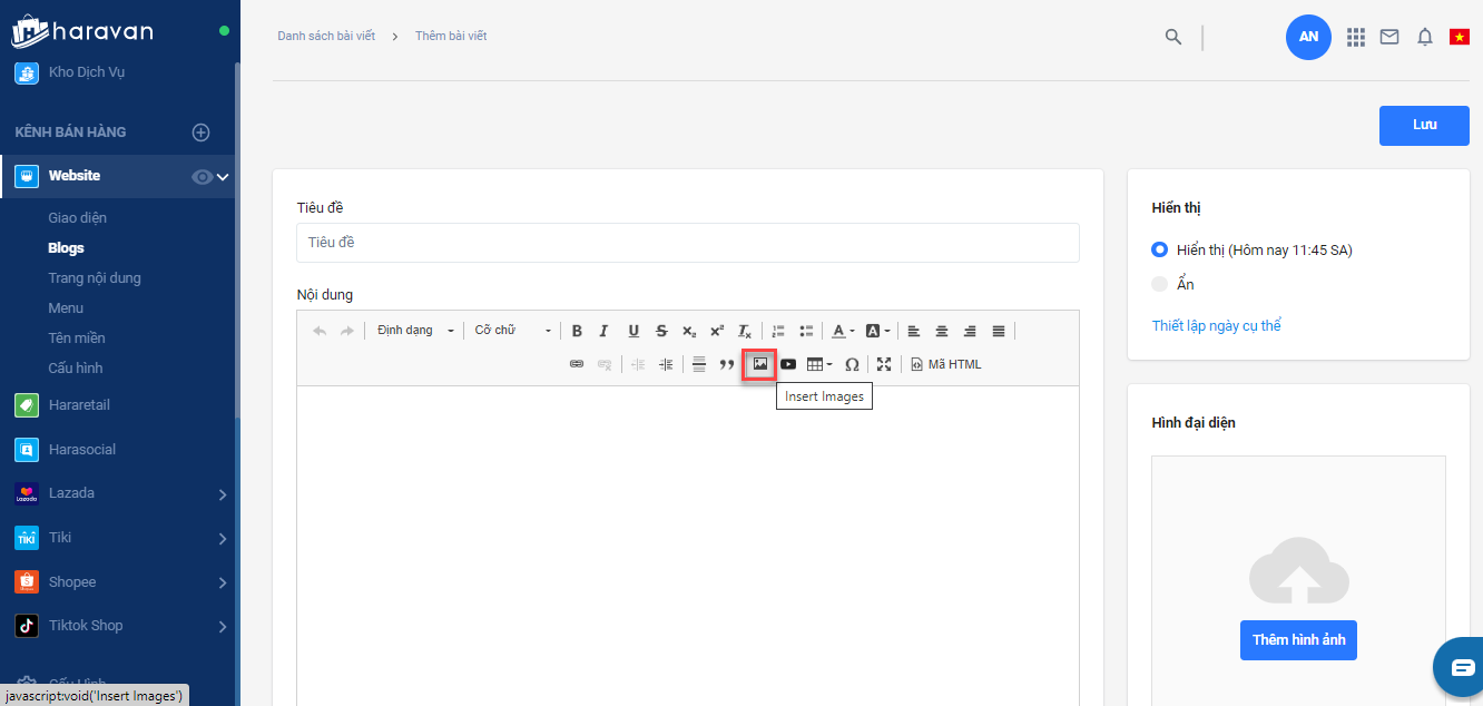 1. Trong mục nội dung mô tả sản phẩm hoặc nội dung bài viết, Nhà bán hàng chọn biểu tượng Insert image.