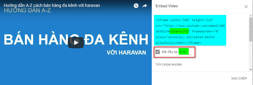 - Với mã nhúng, bạn có thể chọn thời điểm bắt đầu đoạn video khi copy mã (Thao tác này không bắt buộc).