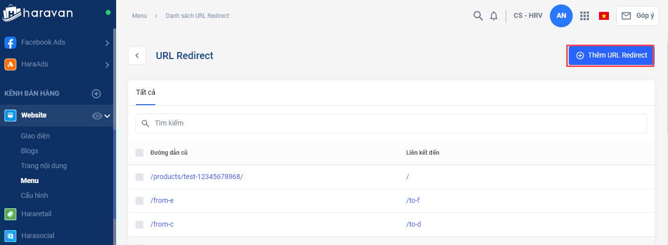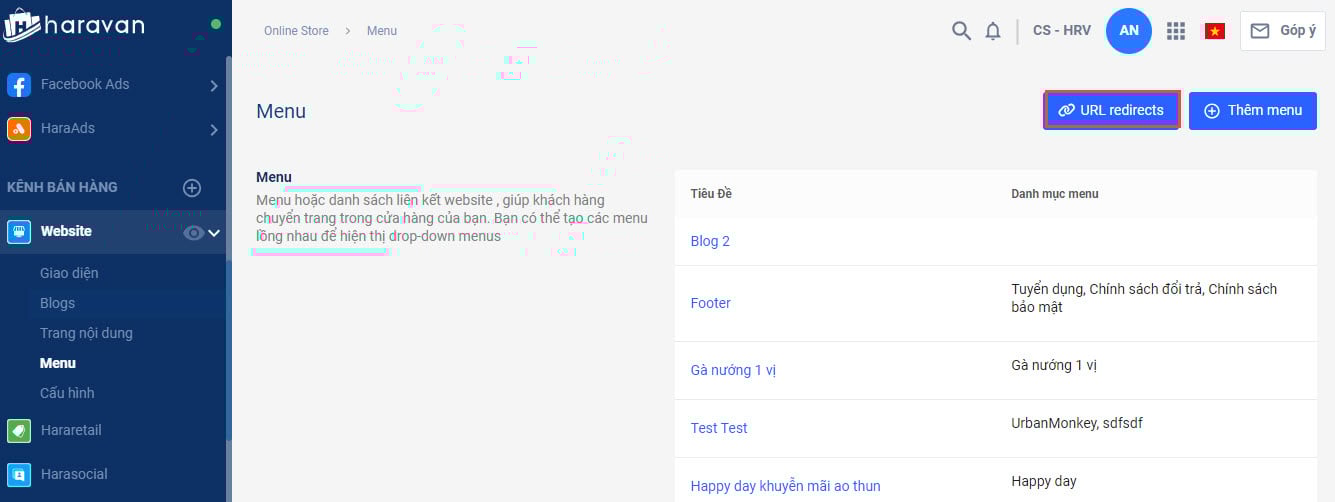Tính năng URL redirect nằm trong mục Menu - kênh bán hàng website