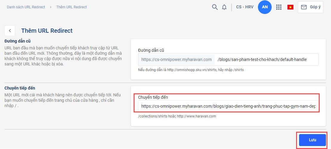 Bước 5: Nhập URL mới vào ôChuyển tiếp đến và chọn Lưu