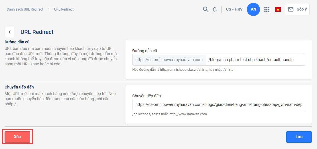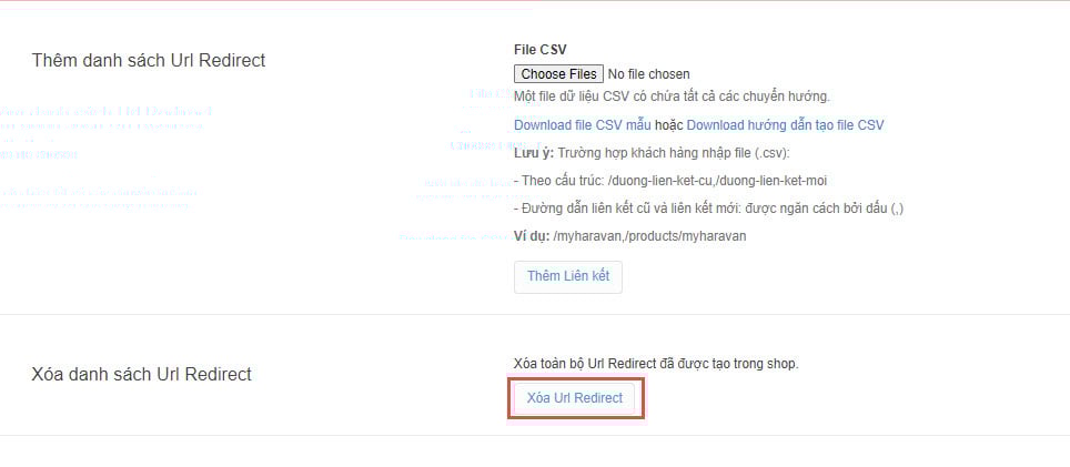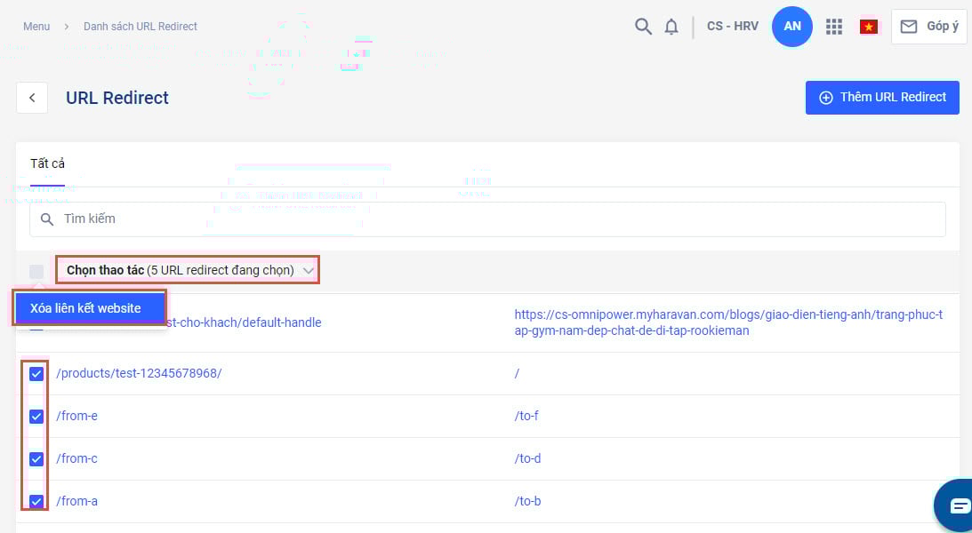 Nếu bạn muốn thay đổi trang điều hướng mới, bạn có thể xóa liên kết chuyển hướng URL. Bạn có thể thực hiện xóa thủ công từng liên kết, xóa các liên kết đã chọn hoặc xóa hết các liên kết URL đã tạo trên trang quản trị MyHaravan