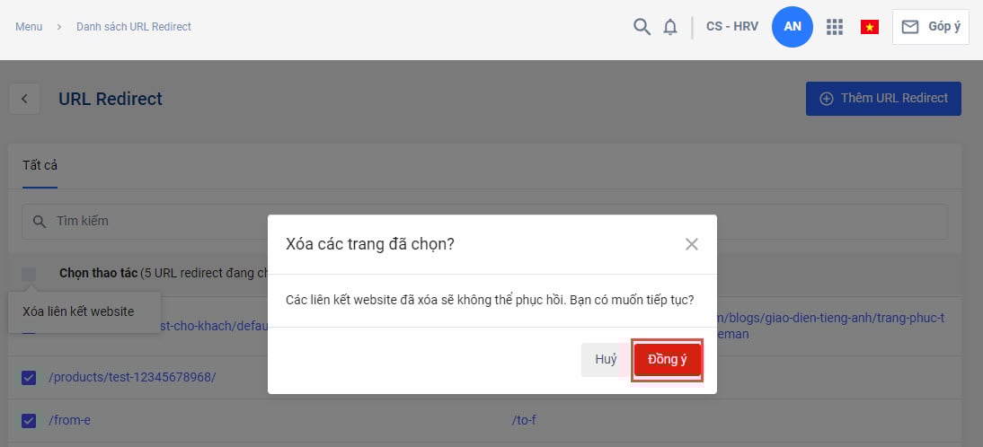 Bước 3: Bạn chọn các liên kếttrong trang sách URL Redirect và chọn Thao tác, chọn Xóa liên kết website