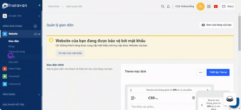 Tại Trang quản trị, chọn Website → chọn Menu