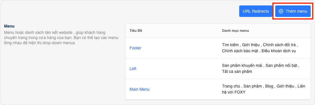Menu là cách dễ nhất để quản lý sơ đồ website của bạn. Bạn có thể nhóm các sản phẩm, nhóm sản phẩm hoặc trang nội dung để chỉ dẫn chi khách hàng dễ dàng đến các nội dung họ cần trên web của bạn.