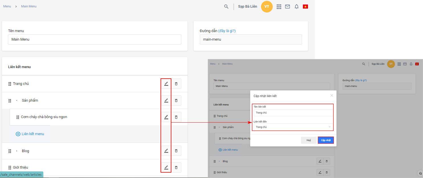 Chọn menu mà bạn muốn chỉnh sửa
