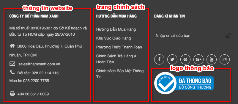 Bên cạnh đó, Nhà bán hàng cũng cần cung cấp đầy đủ thông tin tại một vị trí bất kì ở cuối trang bao gồm Mã số thuế, số điện thoại, địa chỉ,...