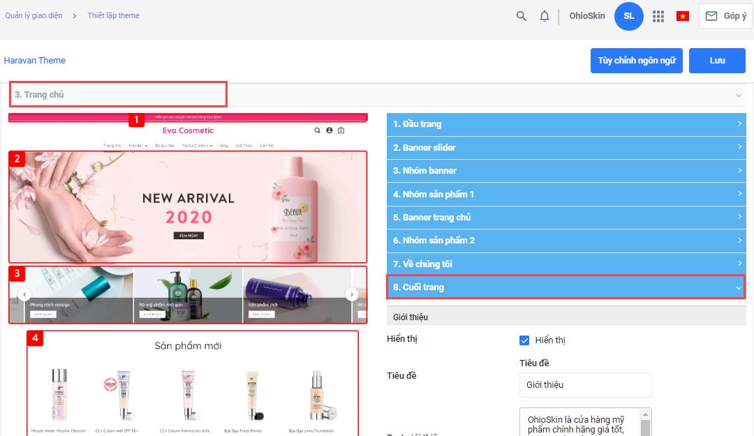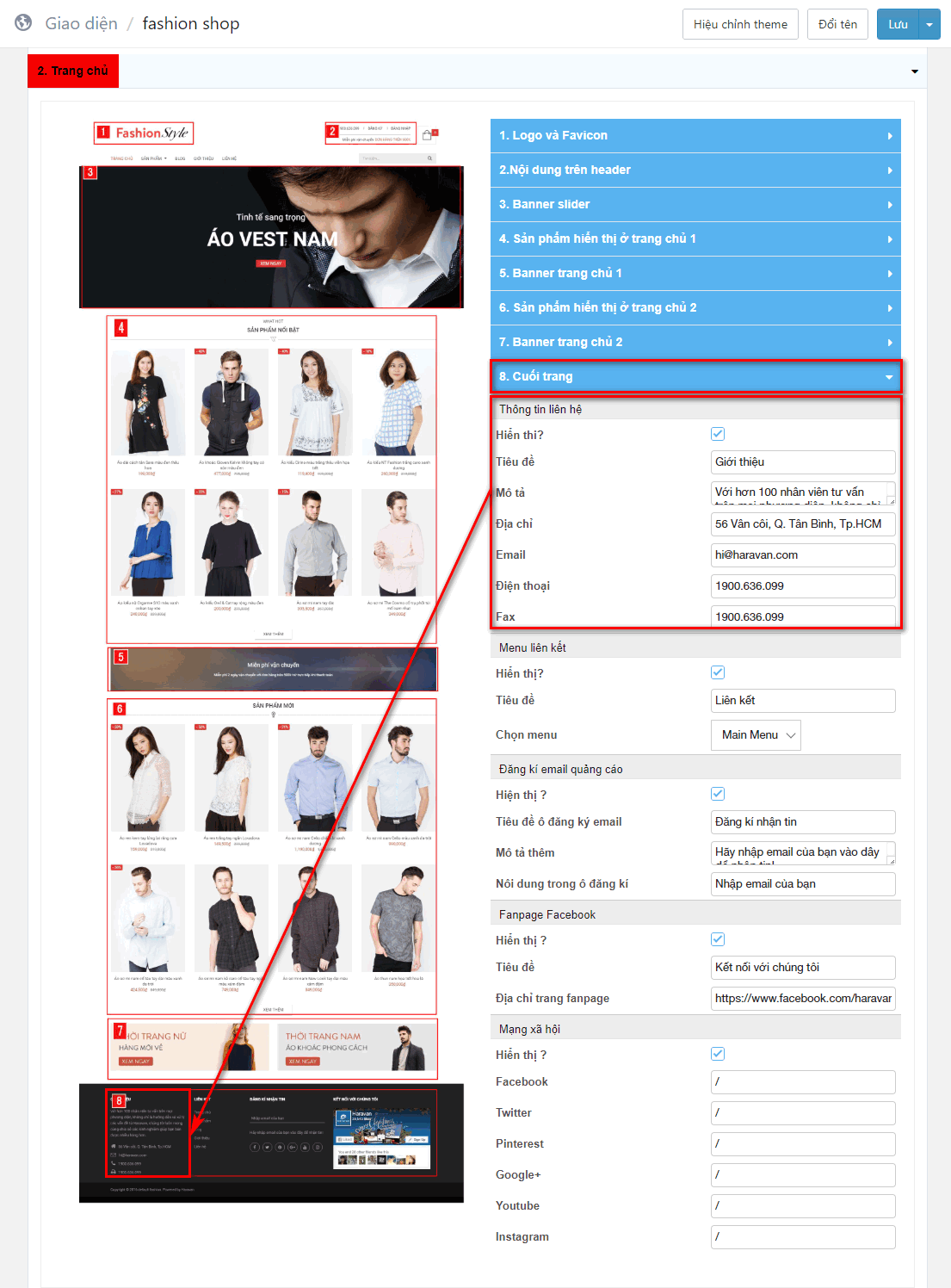 Để thực hiện, Nhà bán hàng vào trong Thiết lập theme, chọn mục Trang chủ, tìm mục Footer/Cuối trang, tìm phần thông tin webisite. (xem hình minh họa).