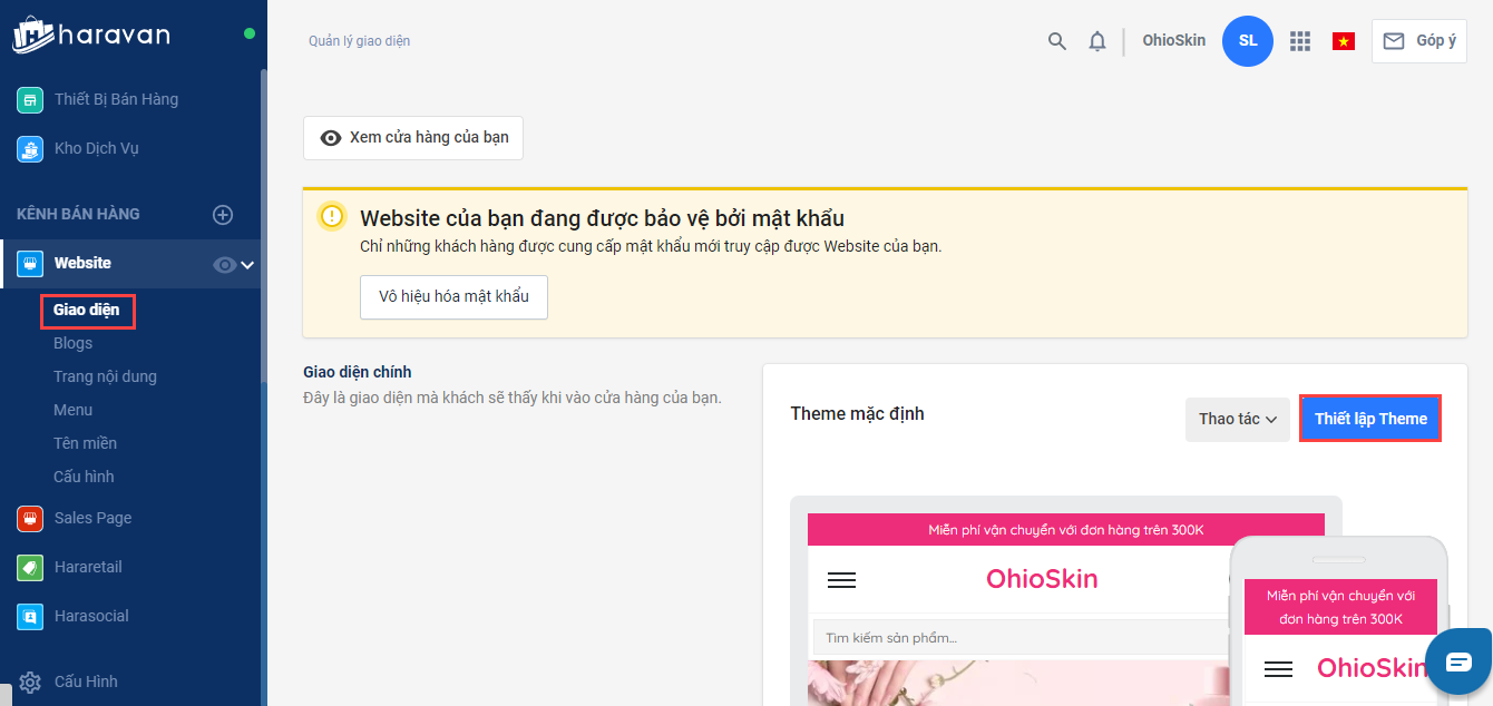 - Trong Trang quản trị, chọn Website và chọn **Giao diện ->**Chọn Thiết lập theme tại giao diện đang áp dụng trên website