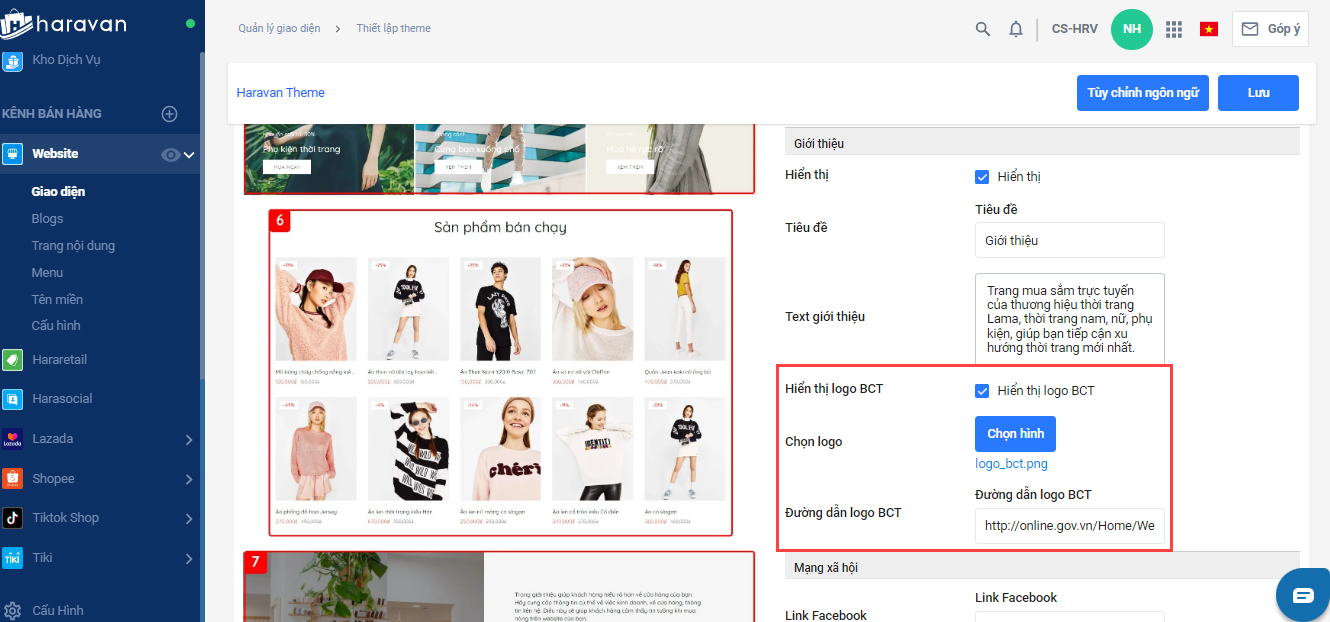 * Bài viết này sẽ hướng dẫn gắn logo và đường link Bộ Công Thương trên giao diện mẫu của Haravan là Lama Fashion. Mỗi giao diện sẽ có vị trị thiết lập khác nhau nên nhà bán hàng cần tìm hiểu trong phần Thiết lập theme trên giao diện của mình.
