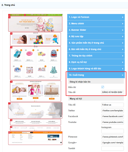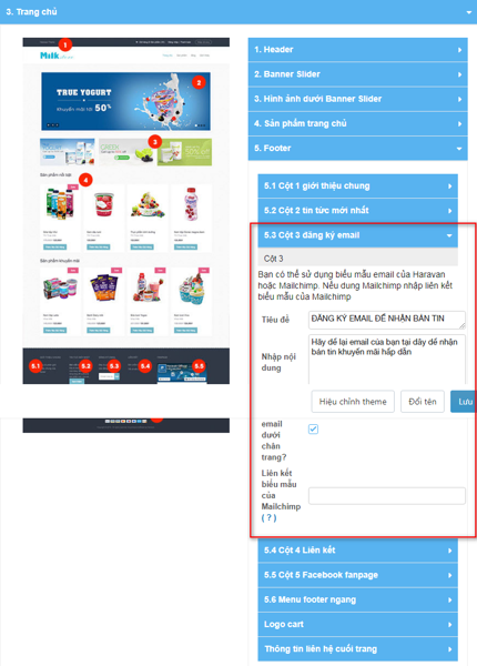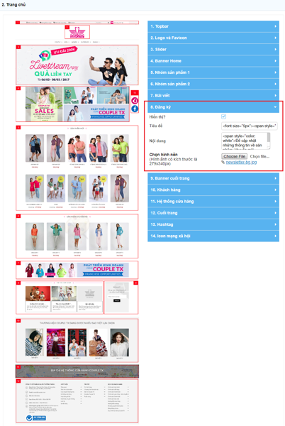 Lưu ý: Một số giao diện không được thiết lập sẵn phần đăng ký nhận tin. Nhà bán hàng có thể tùy chỉnh thiết lập vào một mục phù hợp (footer, cuối trang) hoặc tự hiệu chỉnh giao diện bằng HTML.