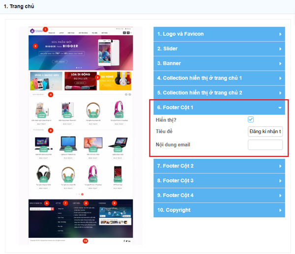 Một số giao diện thuộc trường hợp này: Sam Store, Bicycle shop, Smart, Luxury... Vị trí phổ biến nhất thường là footer cột 1.