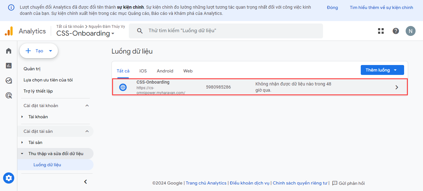 - Bấm chọn vào website bạn đã thêm khi thực hiện tạo tài khoản Google Analytics