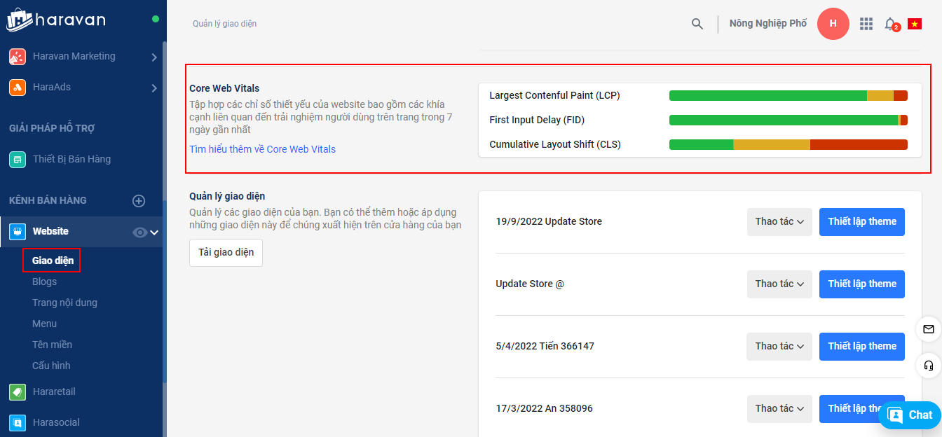 Để xem chỉ số Core Web Vitals trên trang admin Haravan, nhà bán hàng vào mục Website -> Giao diện
