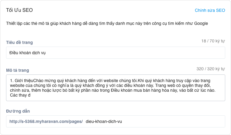 Tiêu đề trang và mô tả trang có giới hạn ký tự. Nếu bạn nhập nhiều văn bản vượt quá giới hạn ký tự, thì sẽ được rút ngắn trong kết quả của công cụ tìm kiếm.