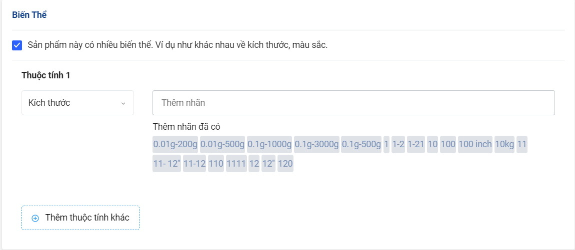 Để tạo sản phẩm có nhiều biến thể, khi tạo mới một sản phẩm, bạn đánh dấu chọn Sản phẩm này có nhiều biến thể. Sau đó lựa chọn loại thuộc tính và nhập các giá trị cho thuộc tính đó.