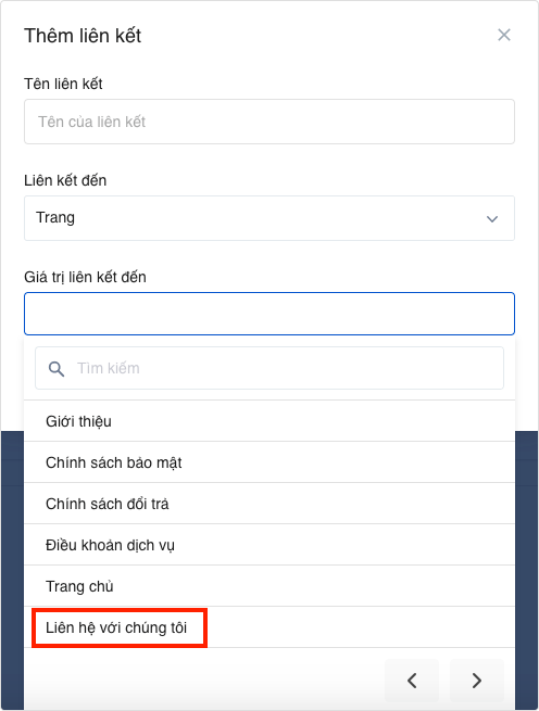 Tại màn hình Thêm liên kết, bạn đặt tên cho menu Liên hệ, loại Liên kết đến bạn chọn Trang, Giá trị liên kết đến bạn chọn Trang nội dung vừa tạo ở bước 1.