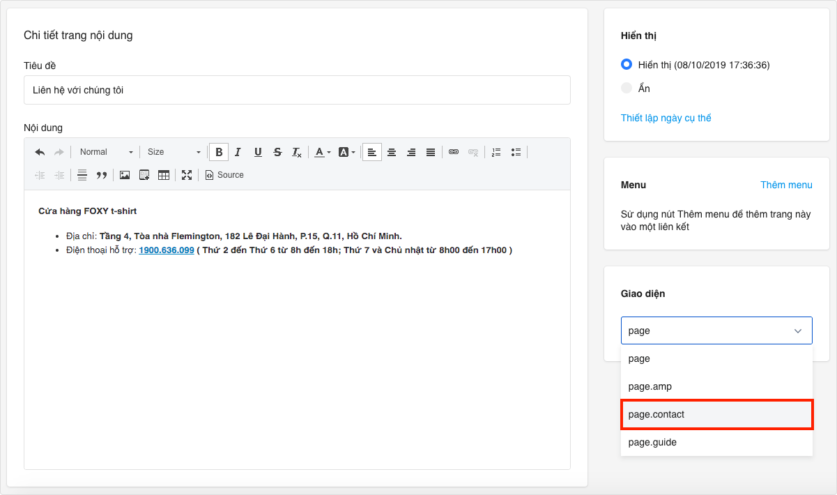 - Trong phần Giao diện, bạn chọn page.contact.