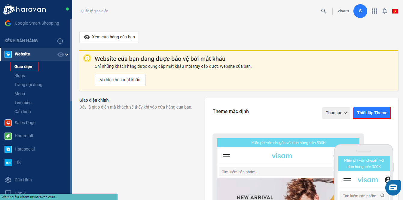 Lưu ý: để có thể bắt đầu kinh doanh nhanh nhất, ngay khi đăng ký tài khoản Haraweb, website của bạn đã được cài đặt sẵn một giao diện mặc định (Theme mặc định).