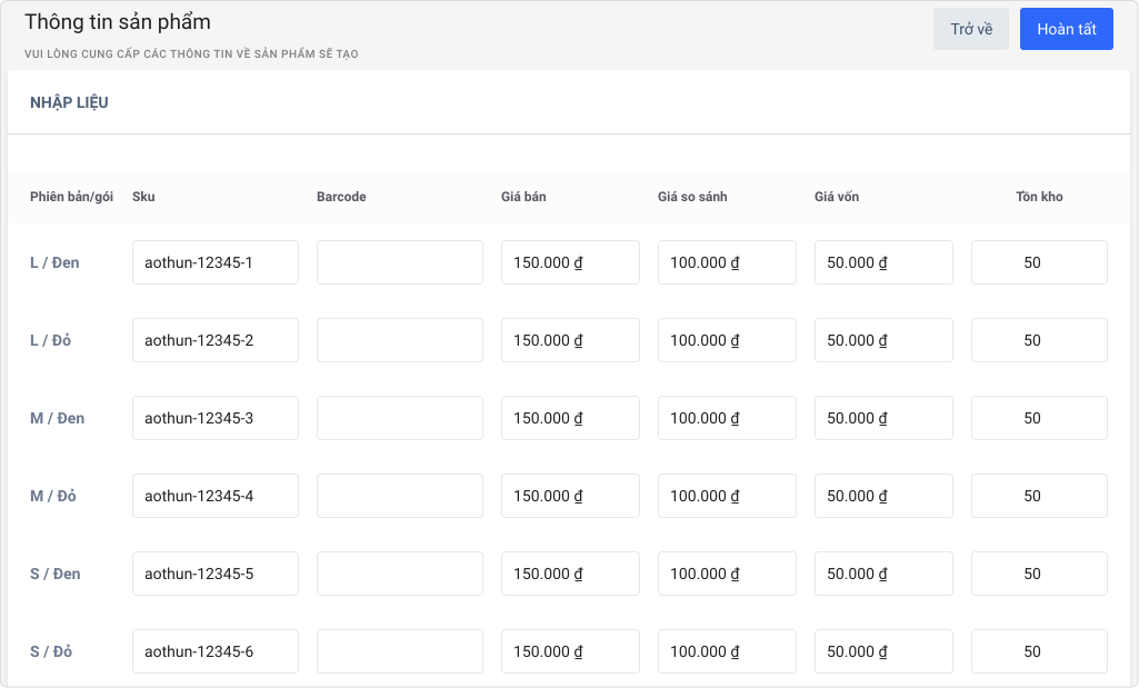 Ví dụ: Giả sử bạn bán một chiếc áo thun có 2 thuộc tính là Kích thước và Màu sắc. Ở phần kích thước bạn có 3 giá trị: Lớn (L), Vừa (M) và Nhỏ (S). Ở phần Màu sắc bạn có 2 giá trị: Đen và Đỏ. Hệ thống sẽ tự tạo ra các biến thể như sau: