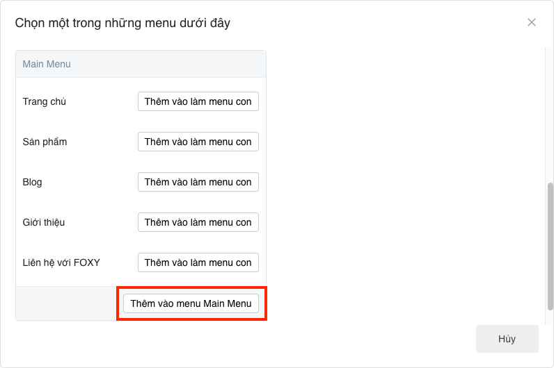 - Trong phần Menu, bạn chọn Thêm menu để hiển thị trang này vào một trong các menu của website. Ví dụ ở đây bạn muốn đưa trang vừa tạo hiển thị ngay trên top menu của website, hãy chọn Thêm vào menu Main Menu
