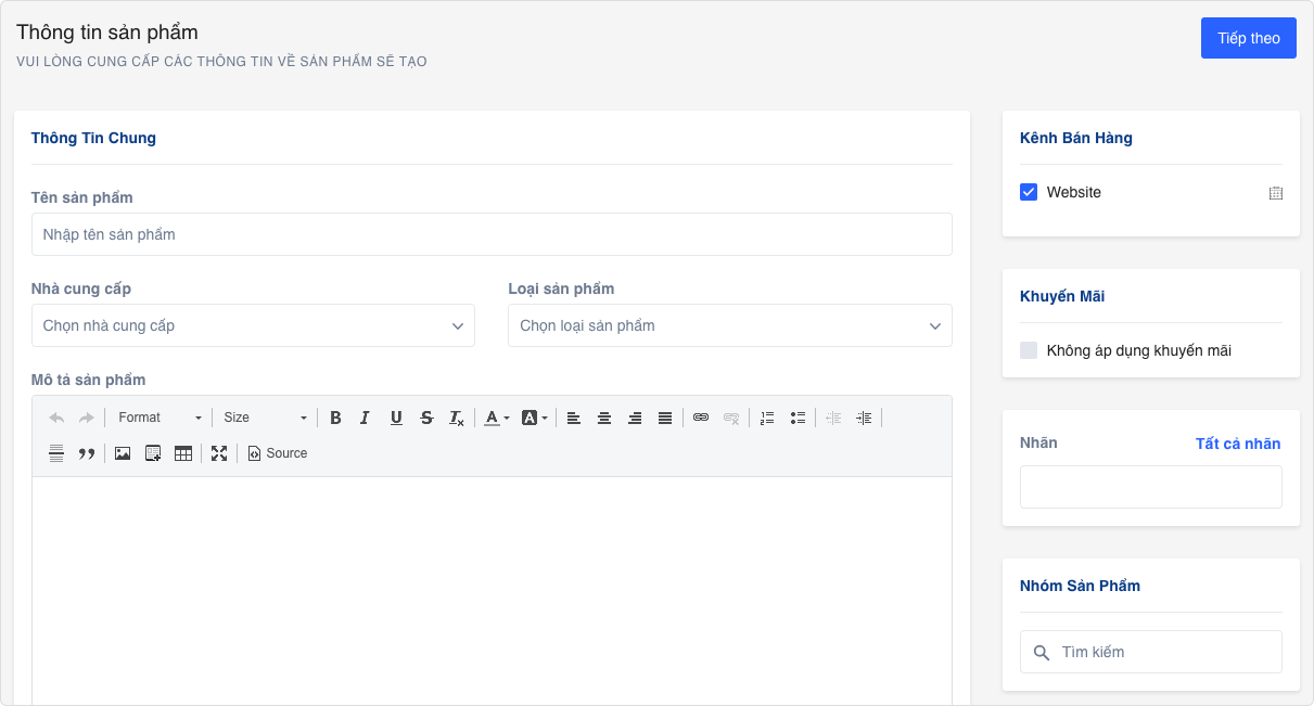 Trang Tạo sản phẩm mới mở ra, nhập các thông tin sản phẩm bao gồm: