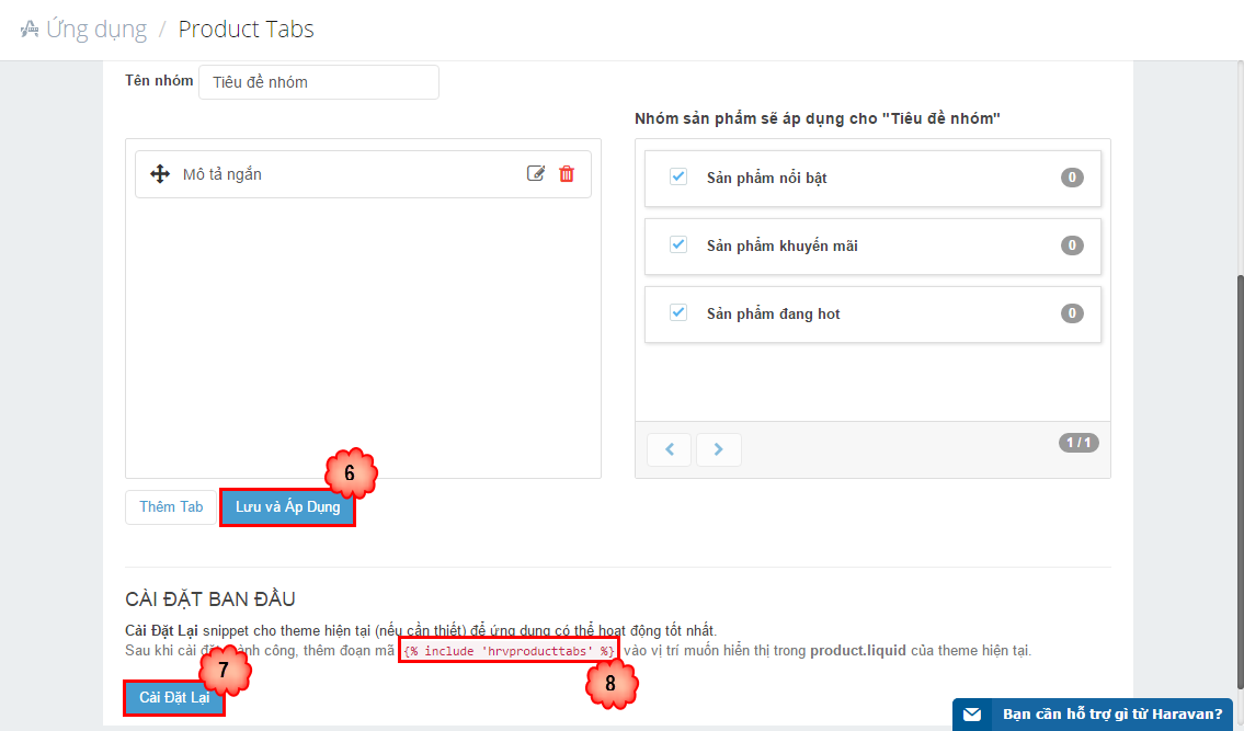 {% include 'hrvproducttabs' %}dán vào nơi người bán muốn hiển thị Tab Mô tả ngắn ngoài website (Phần này người bán có thể nhờ kỹ thuật Haravan hỗ trợ nếu bạn không rành về code).