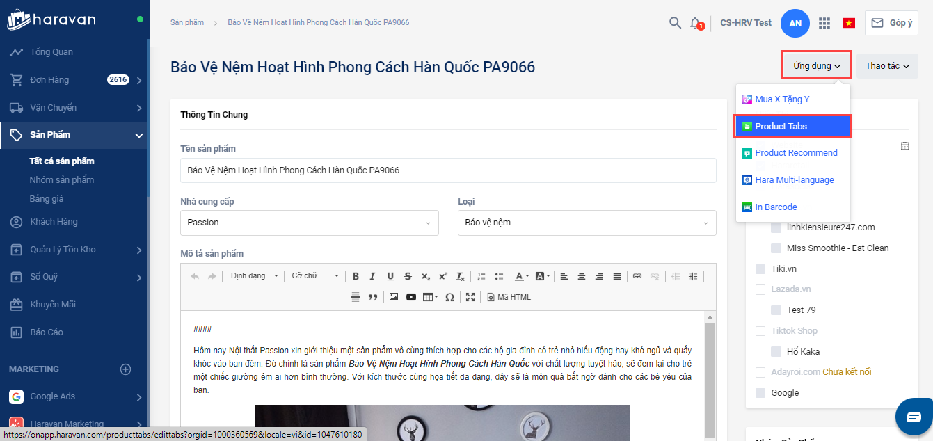 Trong trang chi tiết sản phẩm của sản phẩm đó, người bán nhấp chọn vào Ứng dụng -> chọn Product Tabs