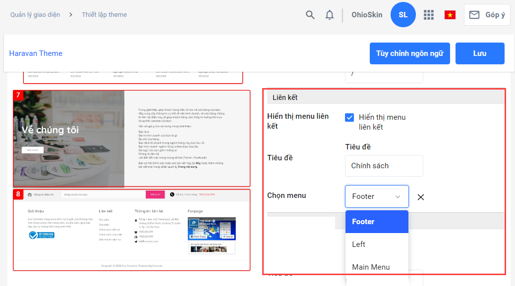 **4. Thiết lập các mục thông tin cho Footer