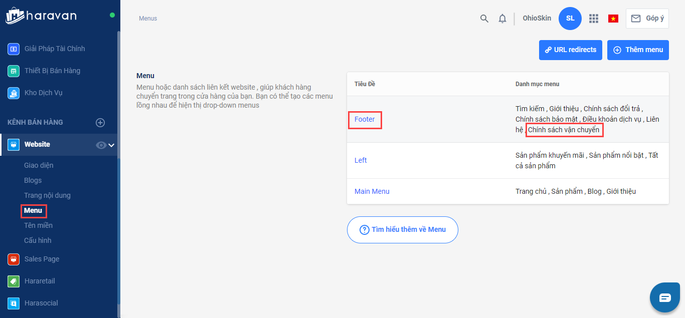 Nhà bán hàng có thể sử dụng menu có sẵn trên giao diện mẫu hoặc tự tạo một menu mới và liên kết trong mục Liên kết để hiển thị lên website