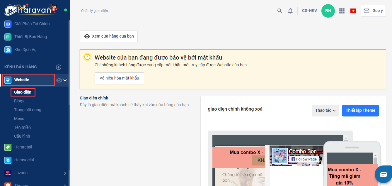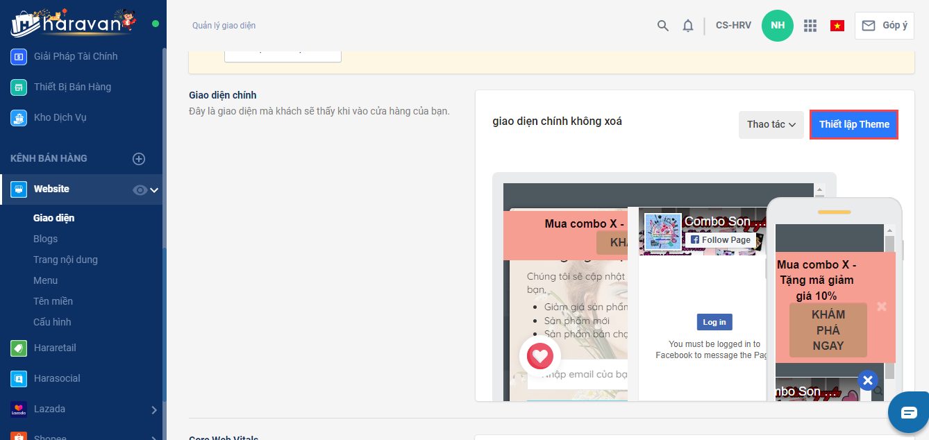 - Trong Trang quản trị, chọn Website và chọn Giao diện