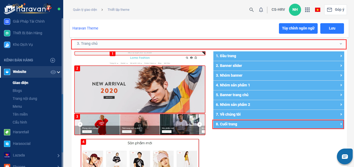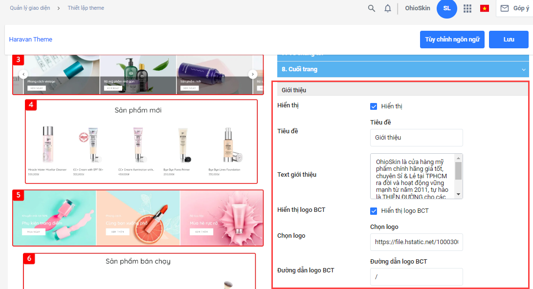 * Bài viết này sẽ hướng dẫn gắn logo và đường link Bộ Công Thương trên giao diện mẫu của Haravan là Lama Fashion. Mỗi giao diện sẽ có vị trị thiết lập khác nhau nên nhà bán hàng cần tìm hiểu trong phần Thiết lập theme trên giao diện của mình.