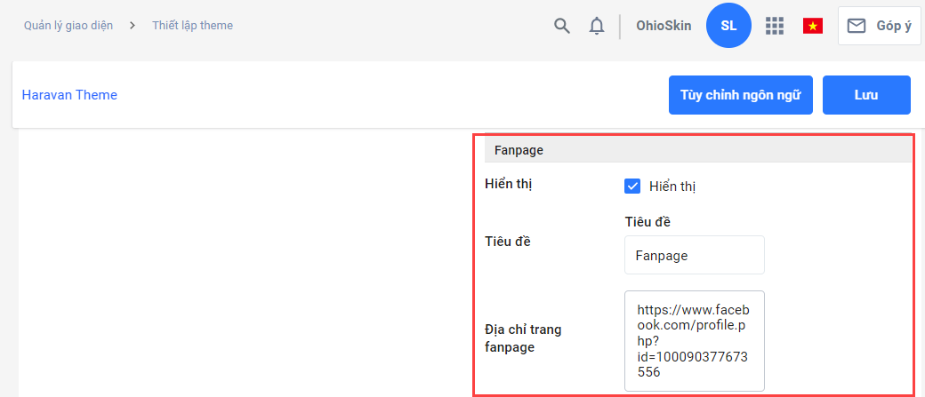 **4.4 Fanpage:**Thêm Fanpage Facebook của nhà bán hàng vào mục Footer