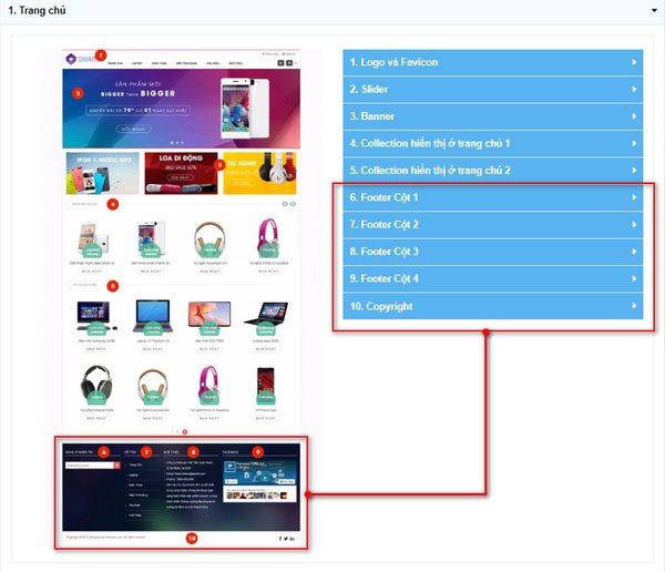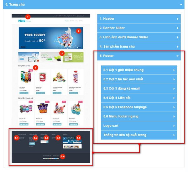 - Nội dung Footer chia theo các cột Footer được đánh số theo từng nội dung.