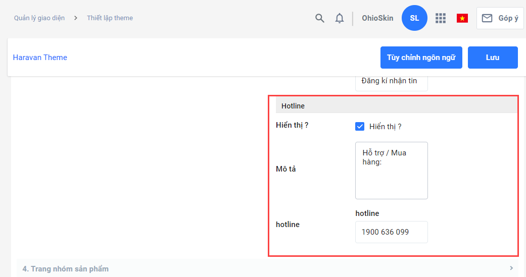 - Chọn/Bỏ chọn ô Hiển thị để ẩn hoặc hiện số hotline