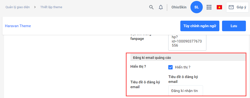 - Chọn/Bỏ chọn ô Hiển thị để ẩn hoặc hiện ô đăng kí email quảng cáo