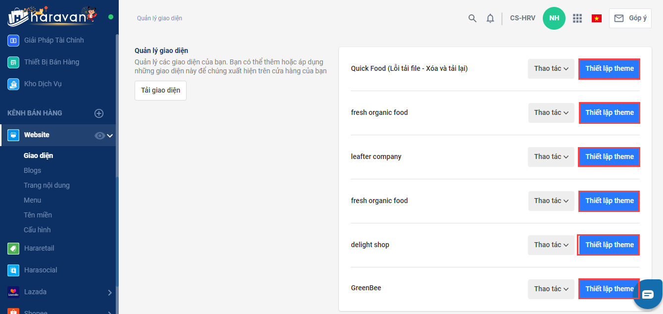 2. Chọn Thiết lập theme trên giao diện bạn cần chỉnh sửa