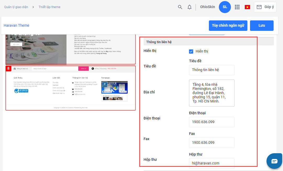 - Chọn/Bỏ chọn ô Hiển thị để hiển hoặc ẩn phần mục thông tin liên hệ