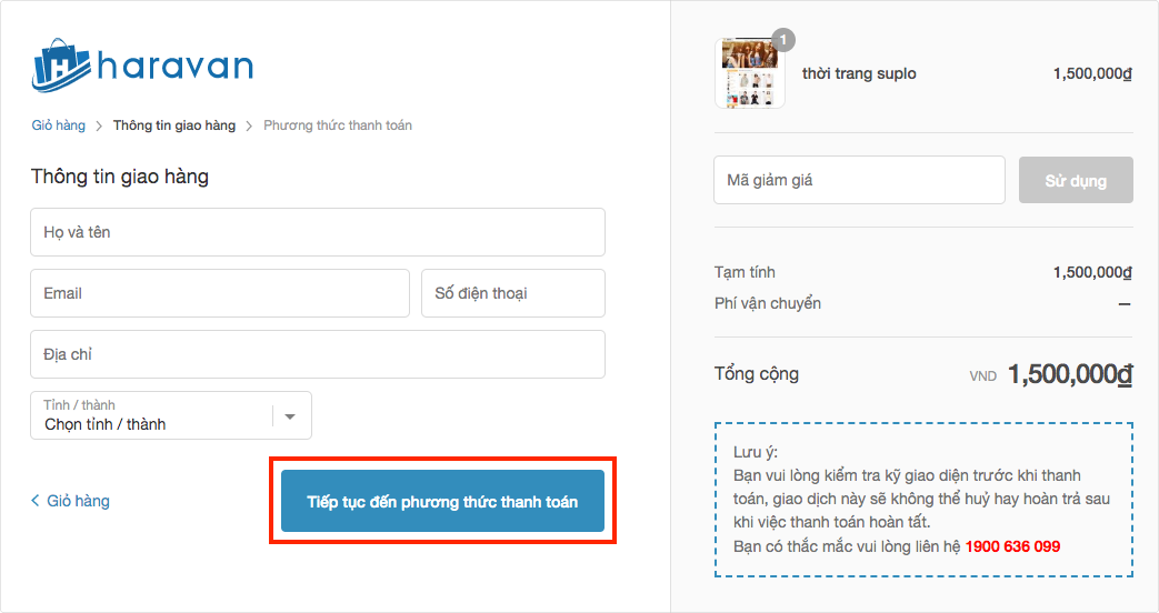 Bạn nhập thông tin và chọn Tiếp tục đến phương thức thanh toán