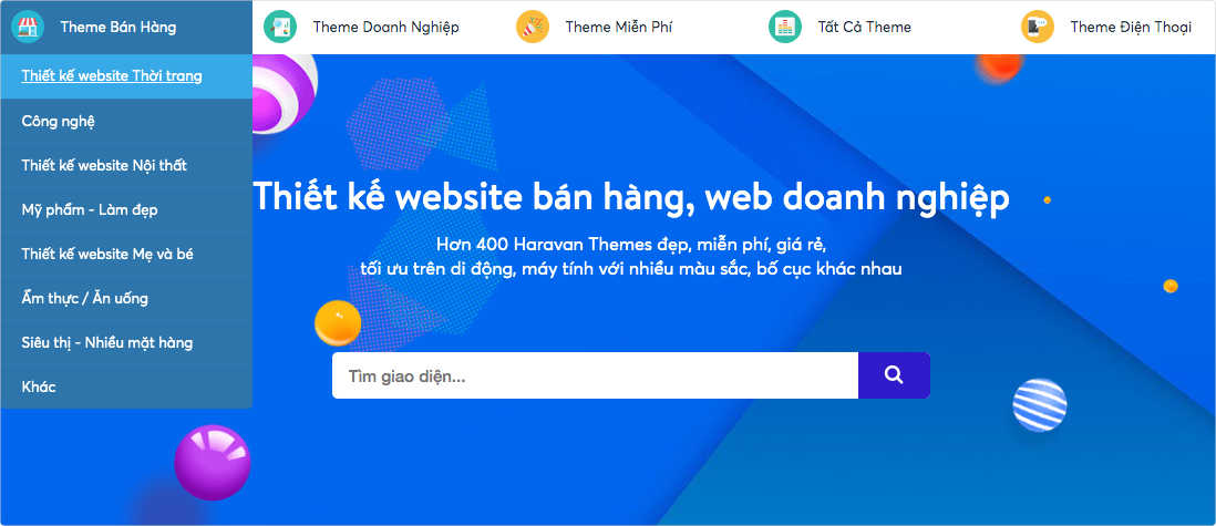 Cách thứ nhất: truy cập trực tiếp vào trang **Haravan Themes.**Bạn có thể nhanh chóng tìm thấy giao diện phù hợp cho doanh nghiệp của mình nhờ phân loại lĩnh vực chi tiết.