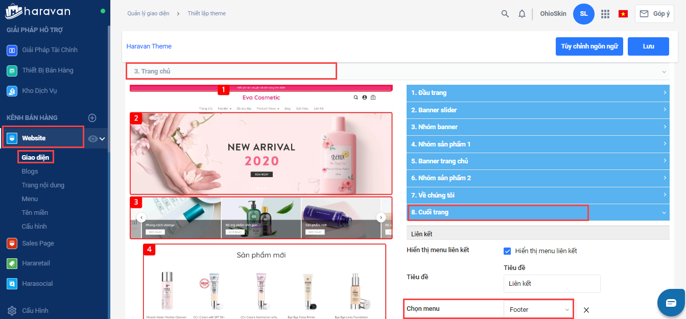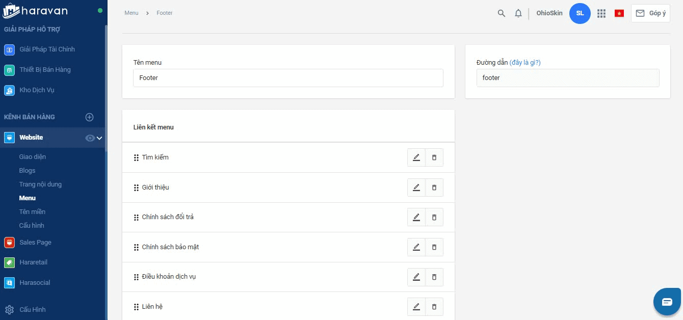 - Tại mụcWebsite, bạn chọn Menu và chọn Menu Footer
