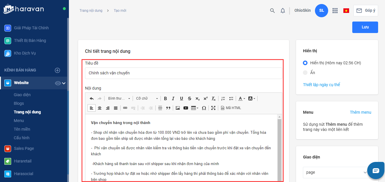 - Tại đây, bạn thực hiện nhập nội dung trang chính sách