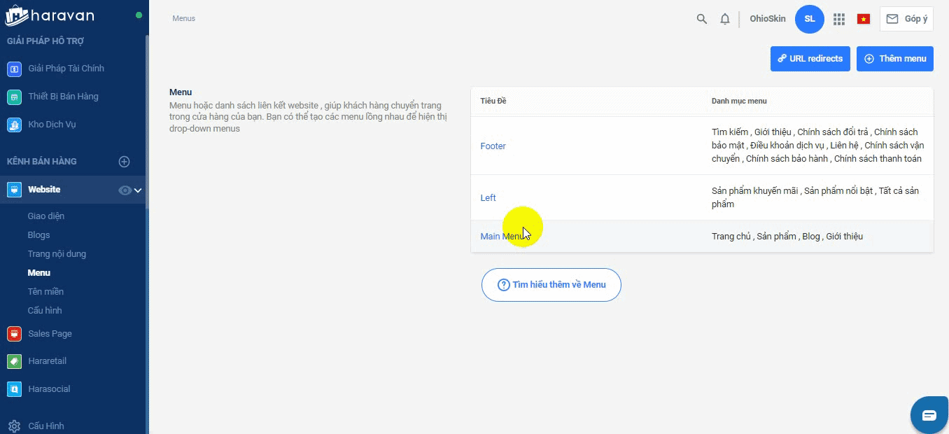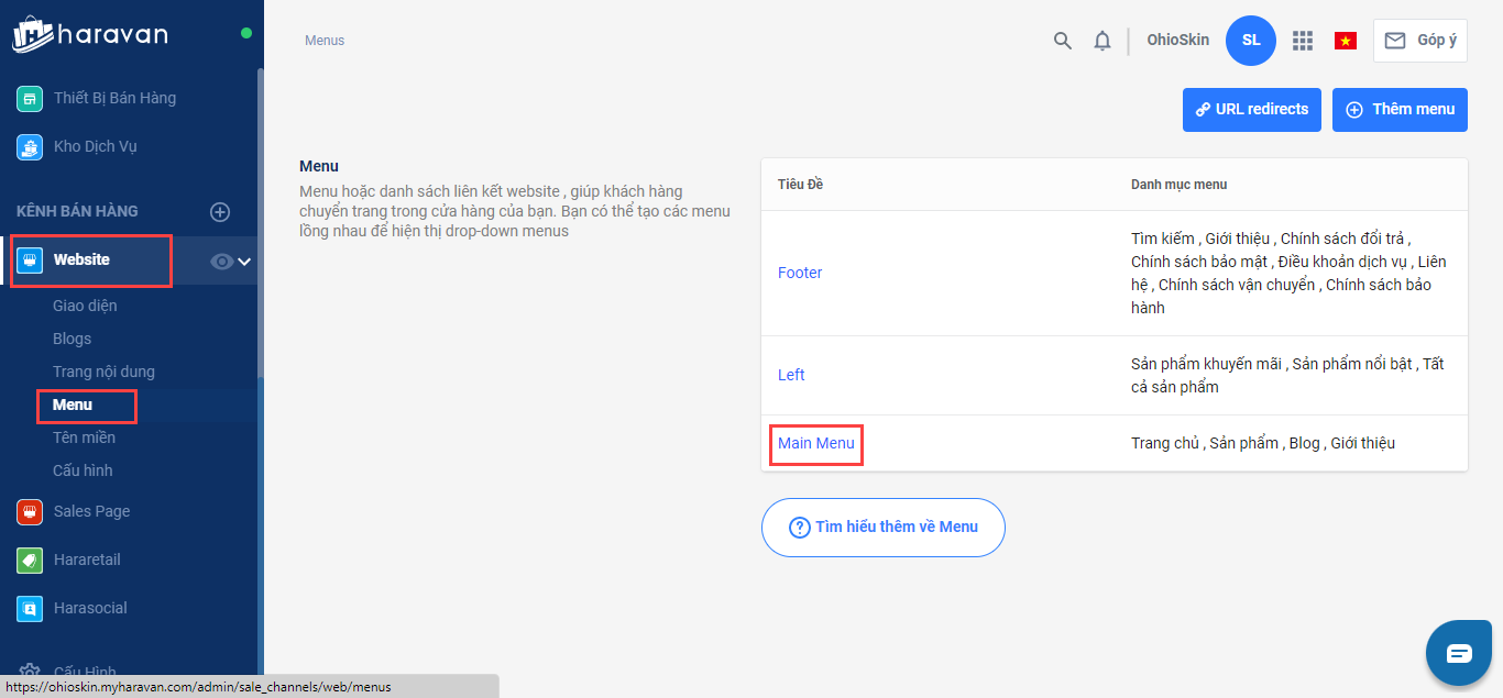 - Tại mục Website, bạn chọn Menu và chọn Main Menumuốn thêm bài viết Chính sách vào