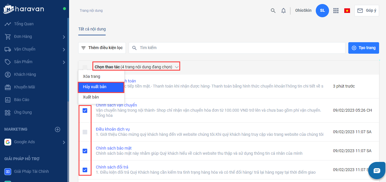 Hoặc thực hiện ẩn hàng loạt bài viết chính sách -> chọn Thao tác và chọn Hủy xuất bản