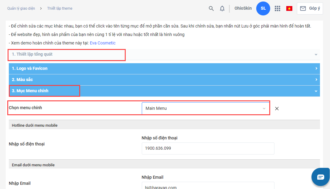 Tips: Bạn có thể tìm mục menu chính trong mục Thiết lập tổng quát -> Mục Menu chính. Tuy nhiên, mỗi giao diện sẽ có cấu trúc khác nhau, do đó nhà bán hàng hãy mở từng mục trên giao diện của mình để xem thử