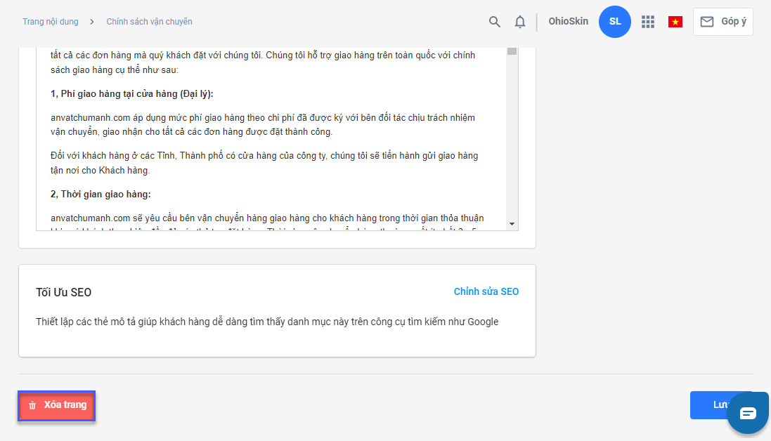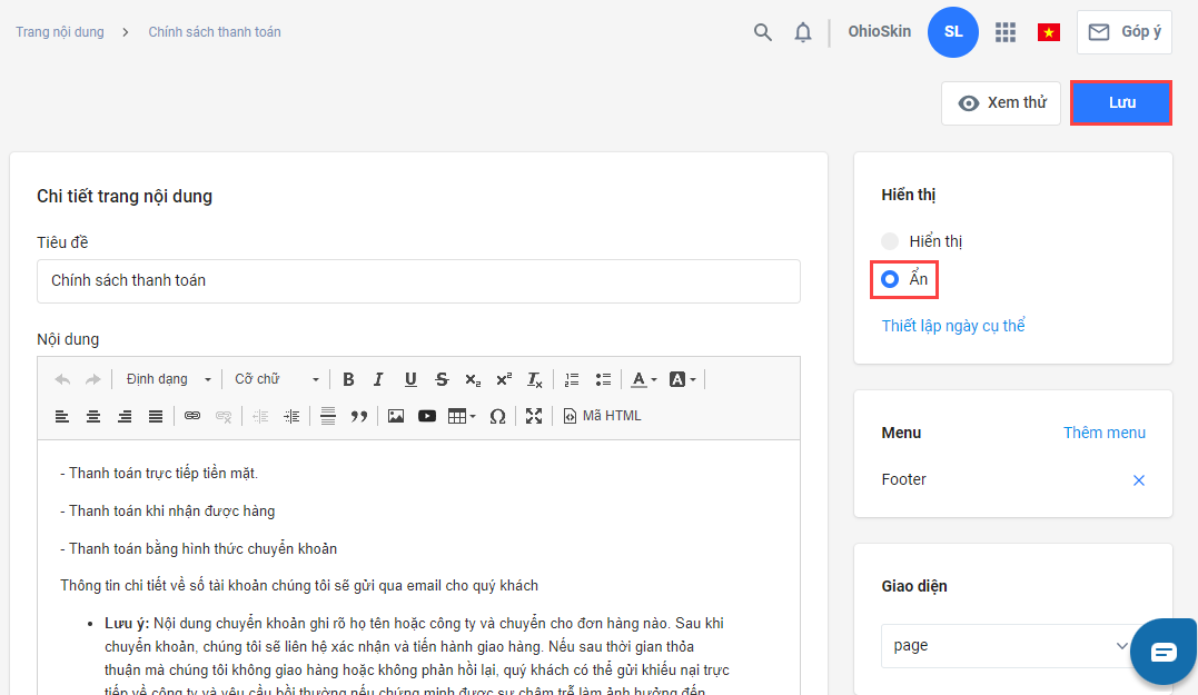 Xóa, ẩn hiển trang Chính sách bán hàng