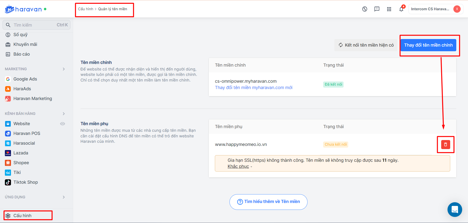 - Thay đổi tên miền chính: Vào Cấu hình > Tên miền > Thay đổi tên miền chính > Xoá tên miền cũ khỏi hệ thống