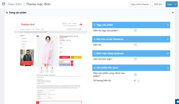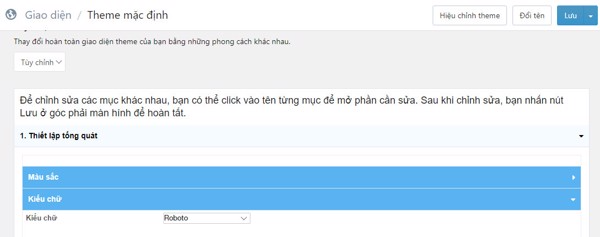 Bao gồm chỉnh sửa màu sắc (màu chữ, màu nền, màu button... cho header, footer, sản phẩm ...) và kiểu chữ cho website.