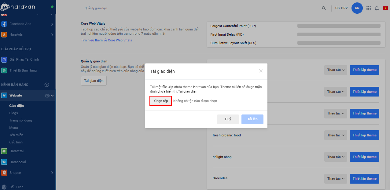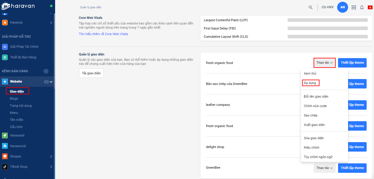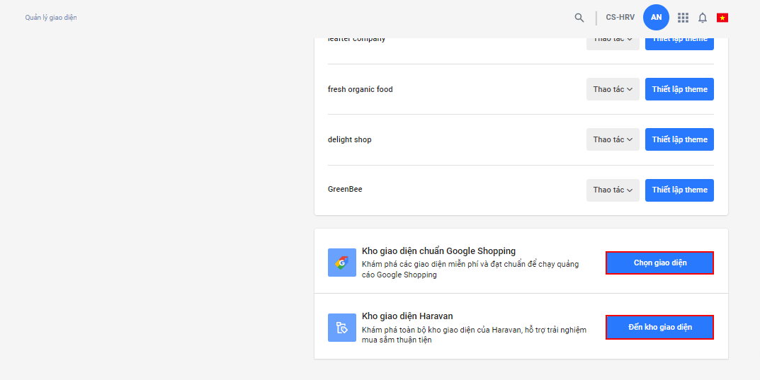 Hoặc có thể chọn một giao diện mới trong Kho giao diện chuẩn Google Shopping hoặc Kho giao diện Haravan.
