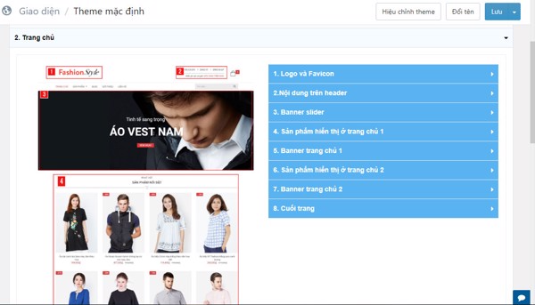 Ở mục này sẽ hổ trợ chỉnh sửa những mục hiển thị ngoài trang chủ như banner, logo, sản phẩm hiển thị trên trang chủ. mỗi mục sẽ có đánh số và khoanh đỏ liên quan đến mục đó để dễ dàng chỉnh sửa.